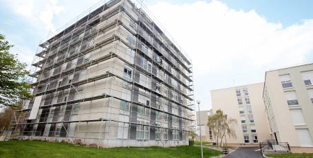 A Sézanne, les immeubles Le Tardenois et L’Argonne font peau neuve en 2012. Isolation thermique par l’extérieur, VMC hygro-réglable, réfection des halls d’entrées, création d’une rampe pour personnes à mobilité réduite… de nombreux travaux extérieurs sont réalisés pour cette deuxième tranche de rénovation, avec pour objectif la diminution des déperditions énergétiques (-50%). L’opération comprend également d’importants travaux à l’intérieur des bâtiments, destinés au confort des habitants mais également à la remise aux normes des installations.